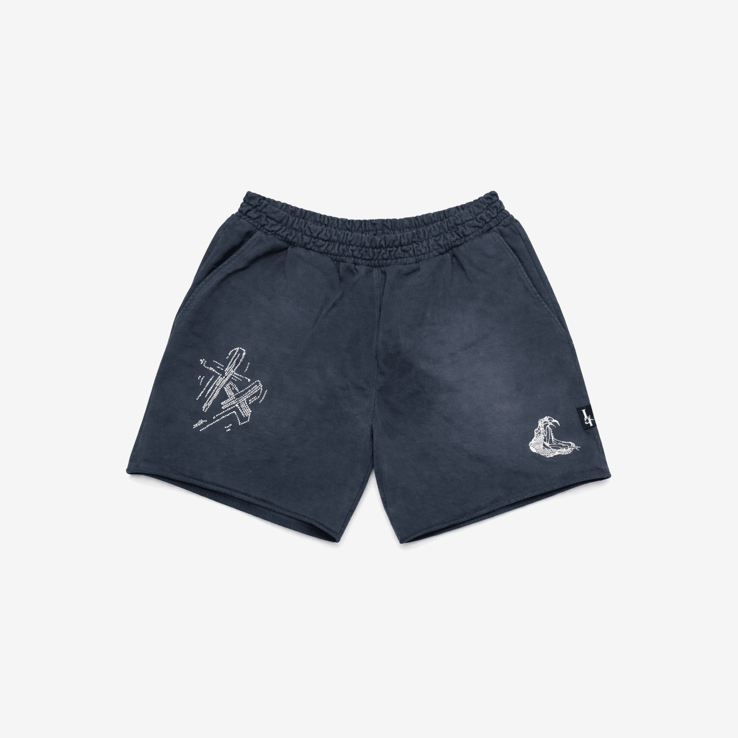 Premium potassium wash fleece shorts featuring rhinestone Double Cross detailing paired with serpent embroidery.